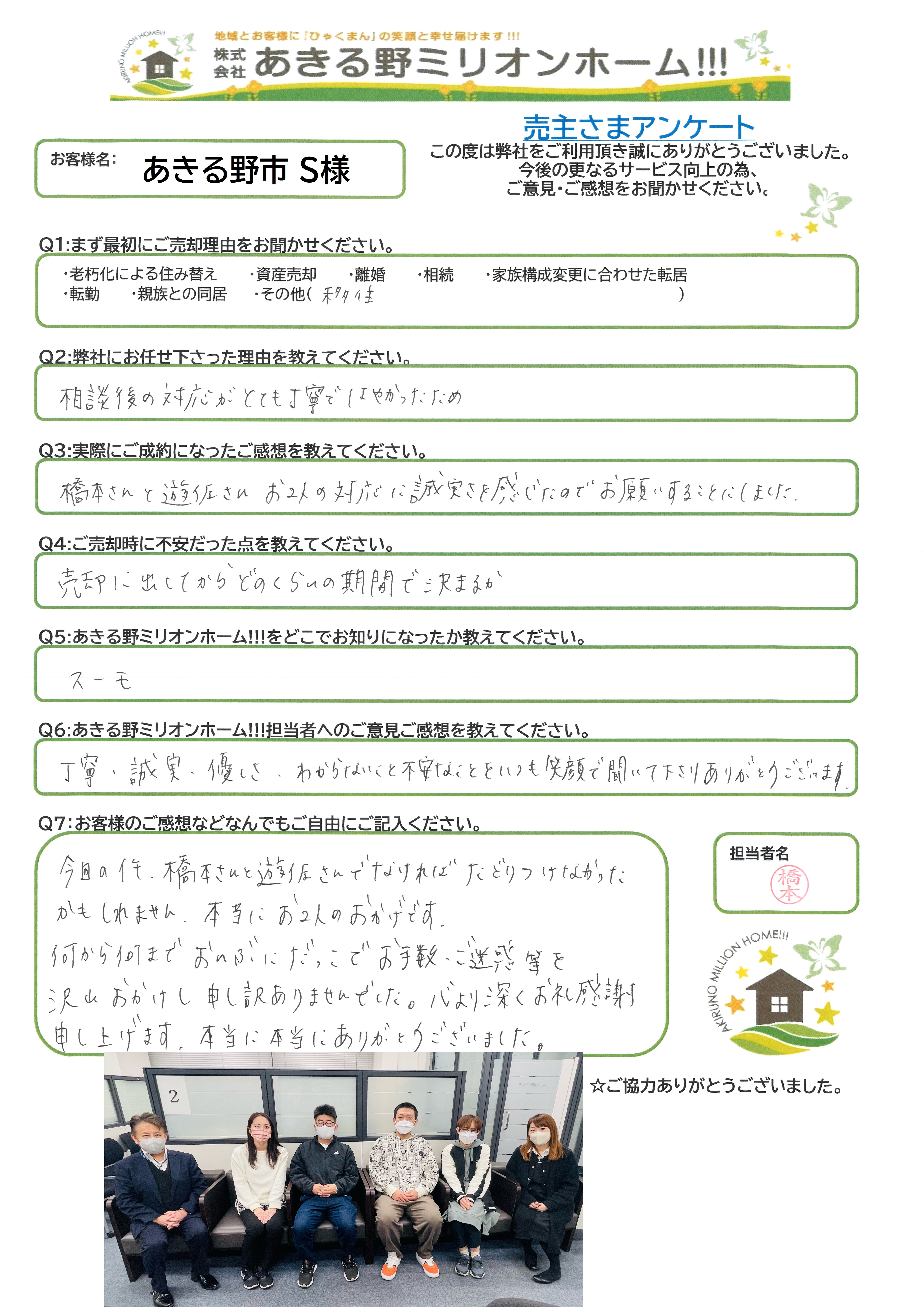Q6:あきる野ミリオンホーム!!!担当者へのご意見ご感想を教えてください。
