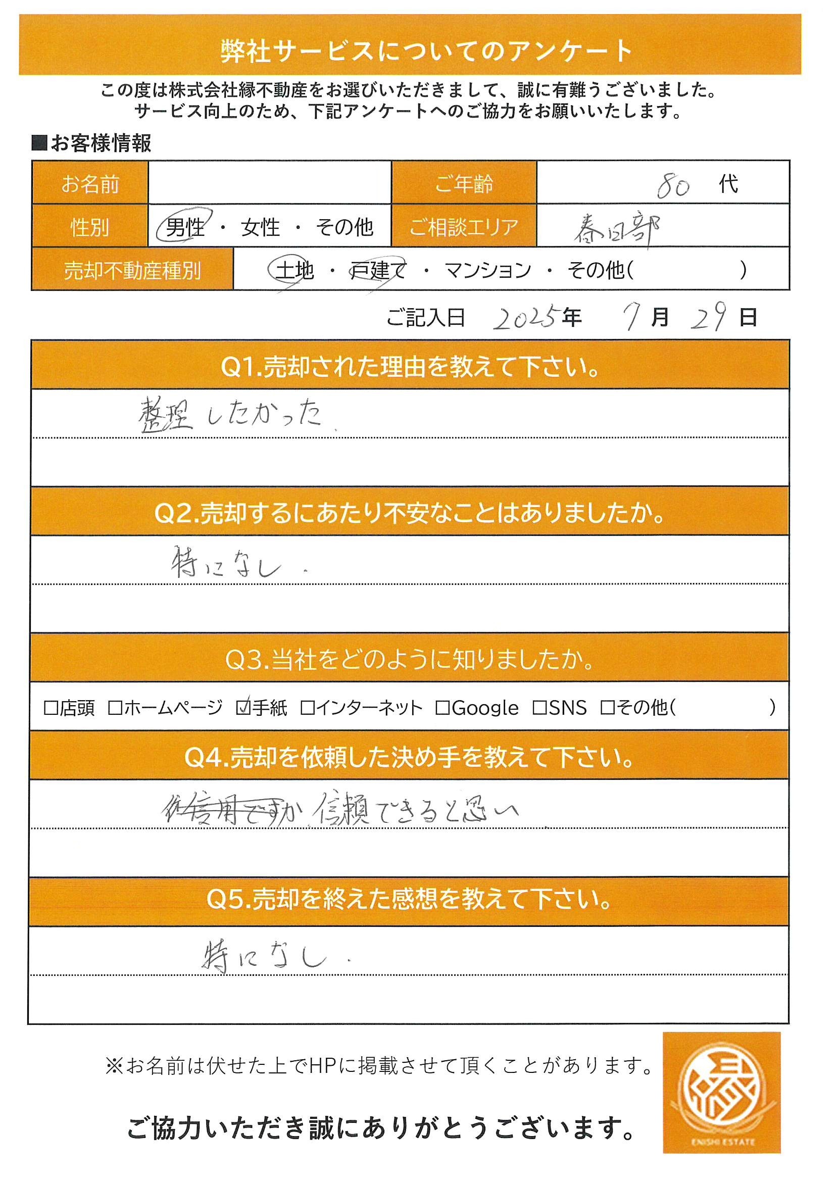 売却不動産種別 ■土地・■戸建て・マンション・その他( )