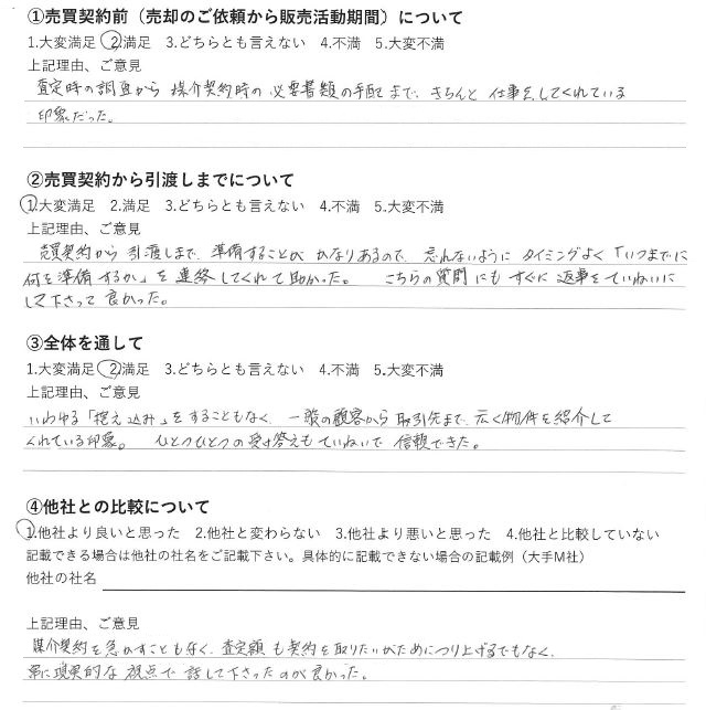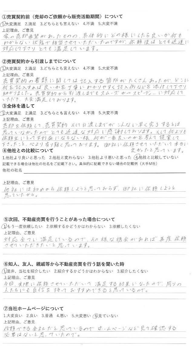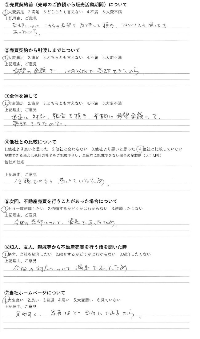 お客様アンケートには、こちらの希望を反映して頂き、アドバイスも適切で、迅速な対応、報告を頂き、1ヶ月以内に希望金額で売却できたことで大変満足という回答を頂きました。