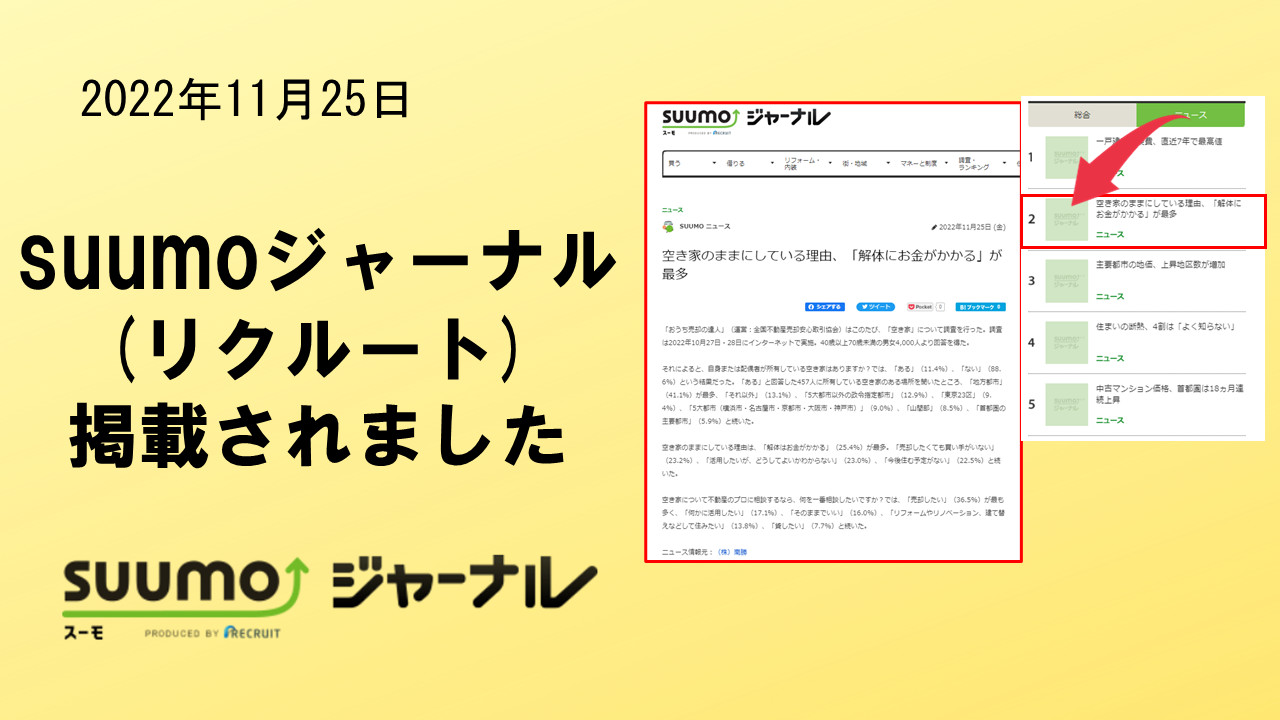 2022年11月25日「 suumoジャーナル」に、掲載されました。 株式会社リクルートが運用する「SUUMO