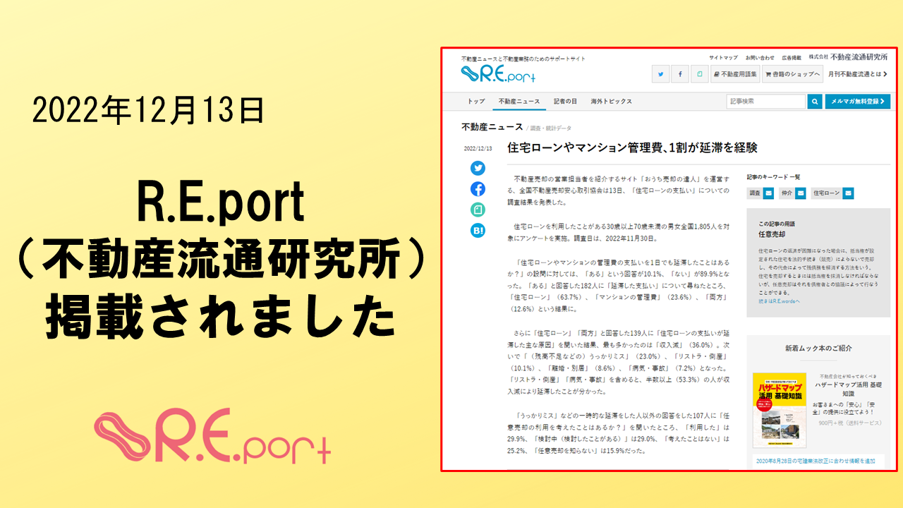 2022年12月13日 「R.E.port」に、掲載されました。 株式会社不動産流通研究所が運用する「R.