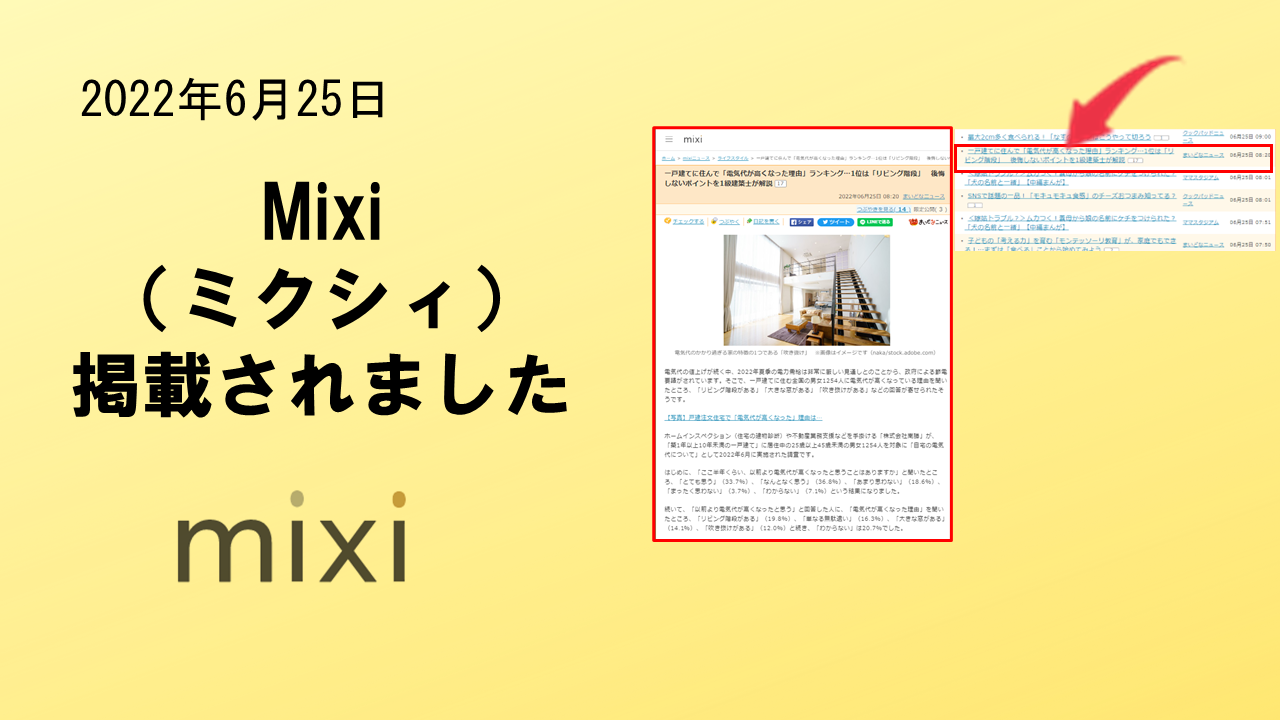 2022年6月25日「mixi」に、掲載されました。 株式会社ミクシィが運用する 「mixi」